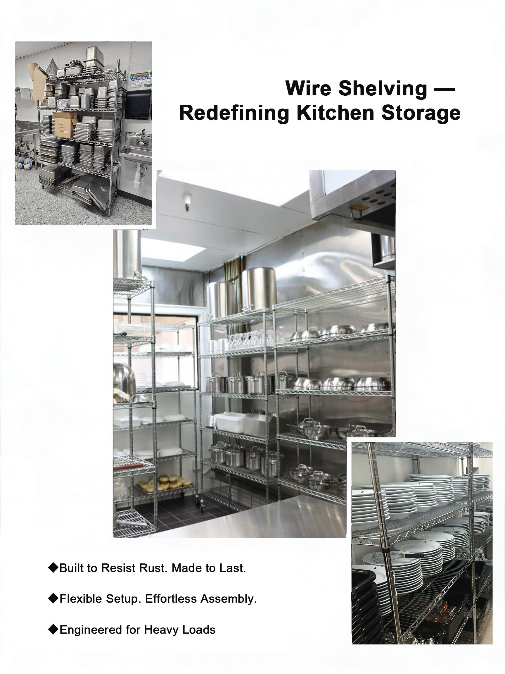 Exceptional Load Capacity & Stability Our wire shelving is constructed from high-strength stainless steel or galvanized steel, specifically engineered to meet the heavy-duty storage demands of commercial kitchens.