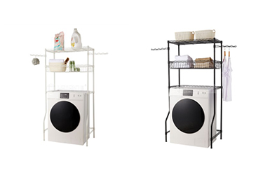 This item is a washing machine metal rack, the size is 75x45xH150cm, but the wire shelf and wire basket, the size is 75x35cm. Th post dia is 19mm, thickness is 1.0mm. The material is carbon steel, surface finish is powder coating in white.It use the plastic clips to install, it is easy.