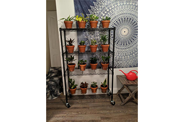 Wire mesh shelving can plant the flowers and don't take up the place.