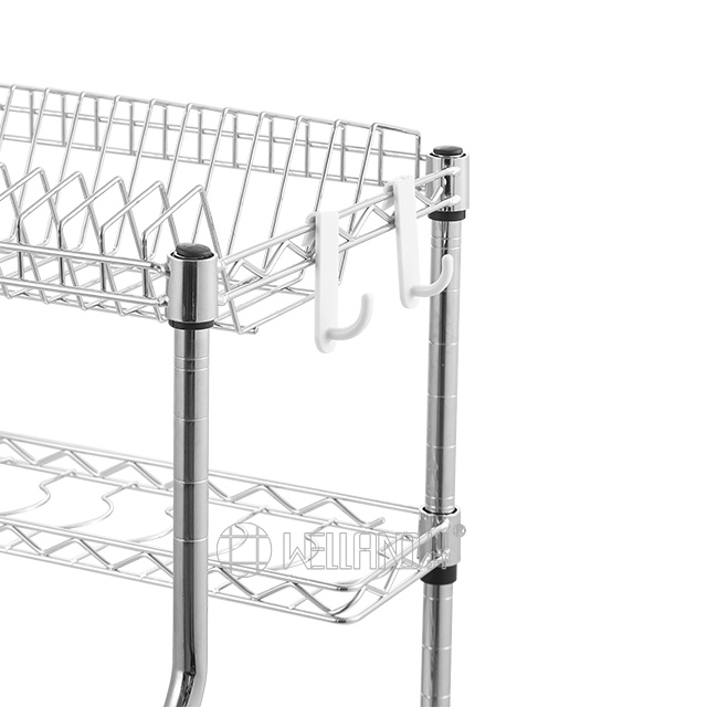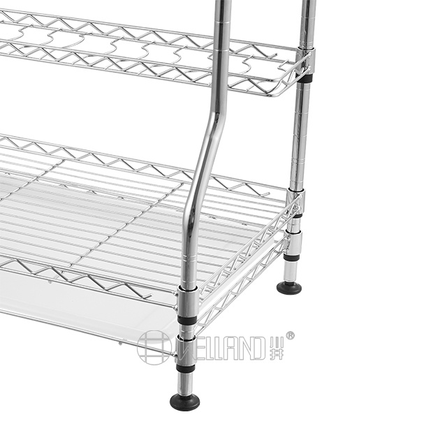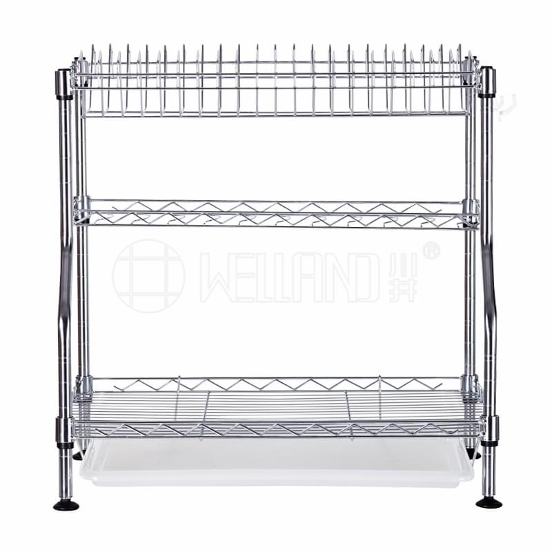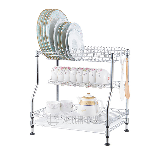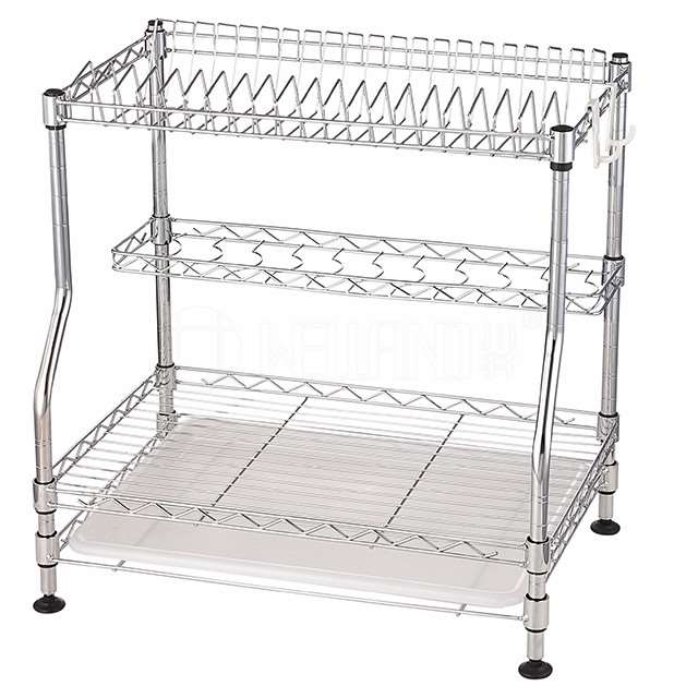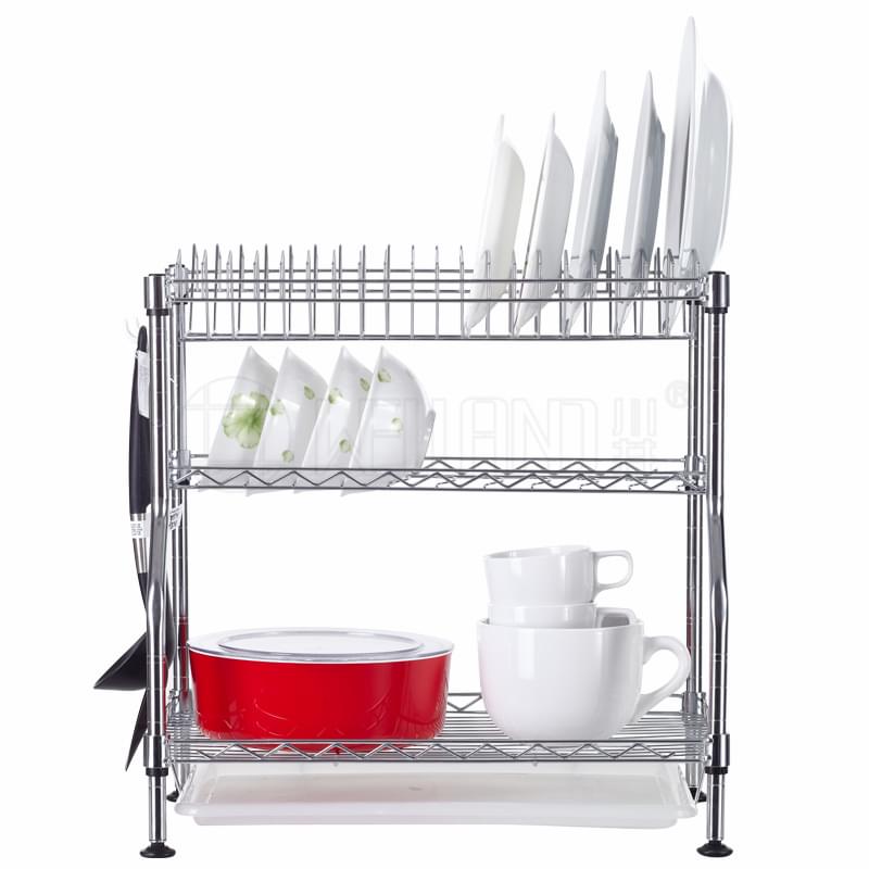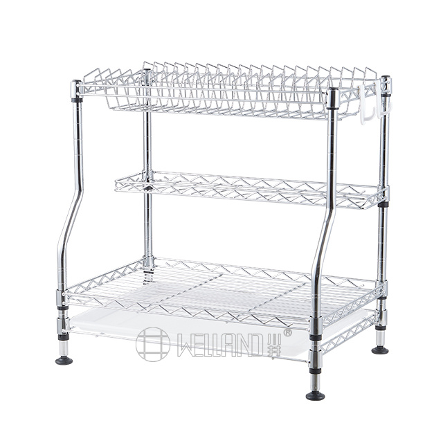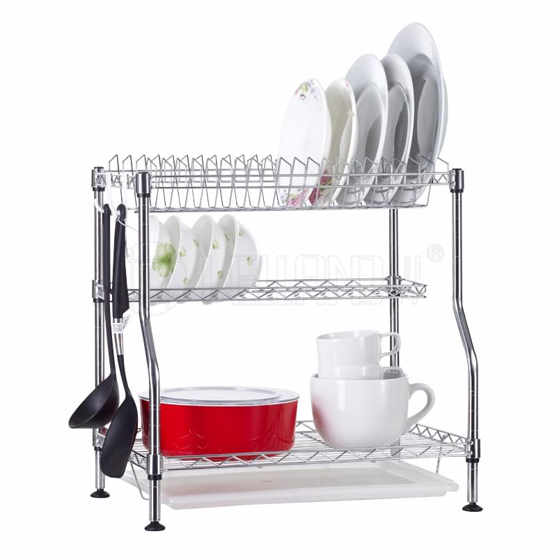 Custom multi-function 3 Tiers Chrome Metal Kitchen Dish Rack with Plastic Hook, can loading 30kg per shelf,and hot sales for many Countries.