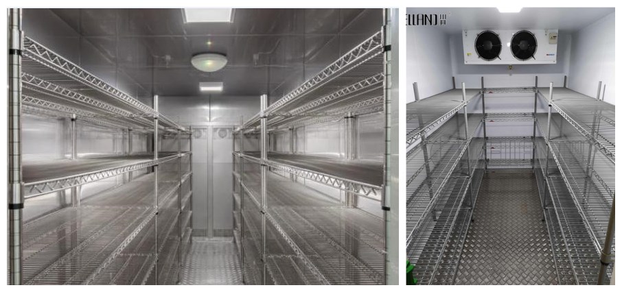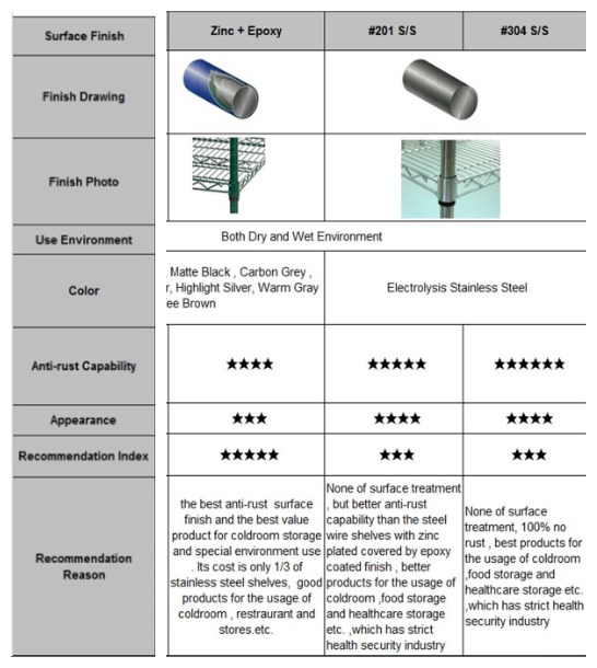 For cold room storage shelving,the surface finish we advise to do with stainless steel or Epoxy+zinc plating.There are #201 stainless steel wire shelf and also #304 stainless steel wire shelf.Stainless steel wire shelf best for food storage and health care storage.