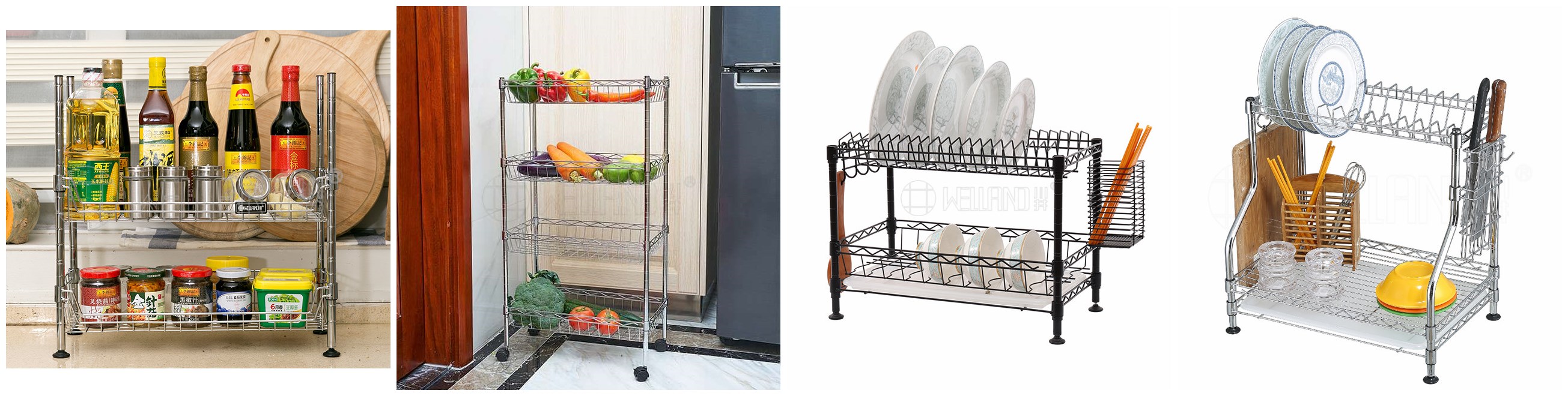 On the video show, we display kitchen storage shelf with different sizes,they can be used on the table, also can be put on ground directly.we also showed dish racks and so on