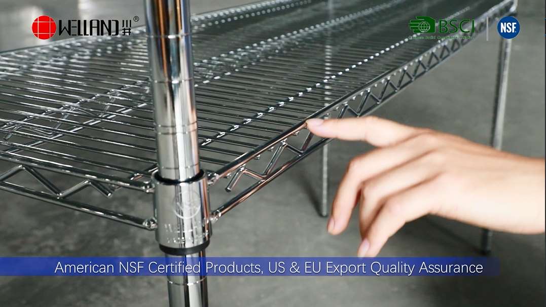 Wire shelving cart with wheels, easy to move in places. Shelf mesh is flat, smooth and no burrs.Automatic welding machine, welding spot is firm. American NSF certificate products, US & EU export quality assurance.