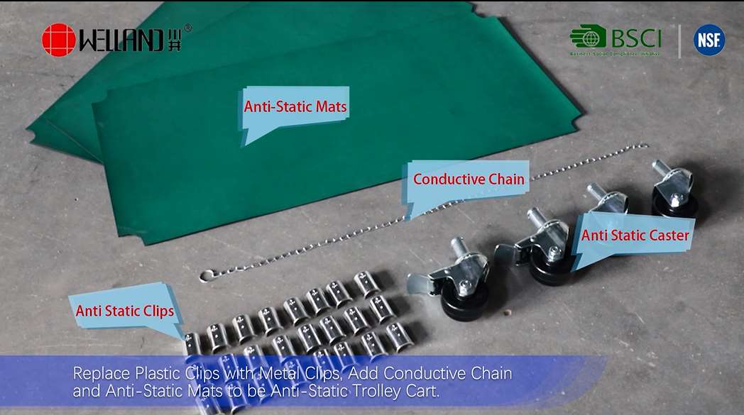 Can use with side ledge to prevent the stores falling off. Also can replace plastic clips with metal clips, add conductive chain and anti-static mats to be anti-static trolley cart. This style trolley cart usually will be use in factory.