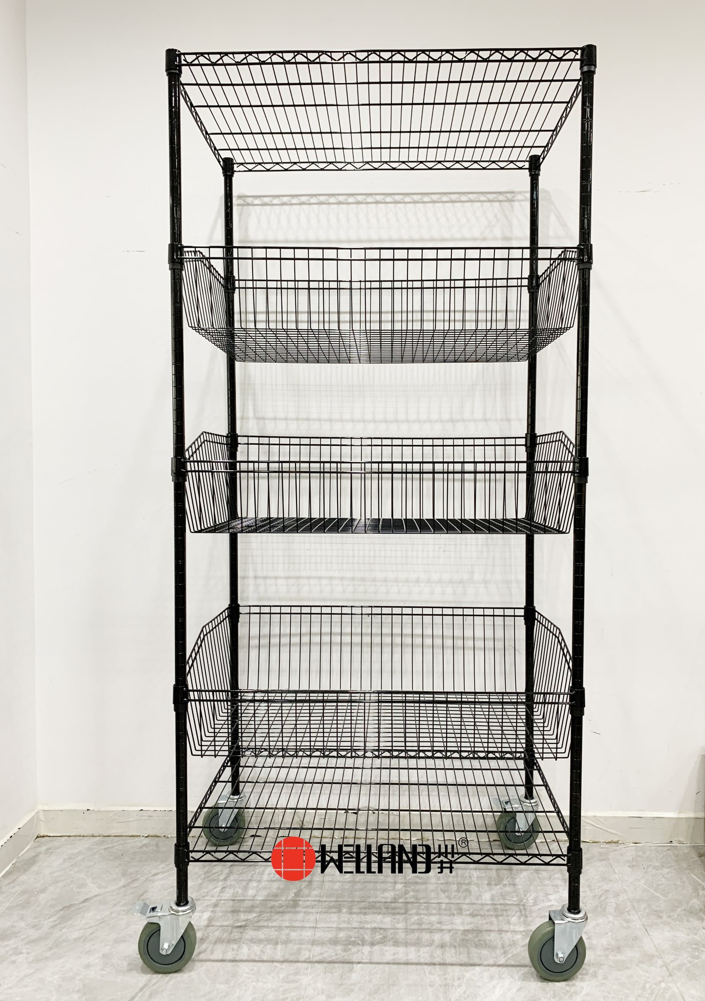 Introducing our New Product: 5 Tier Wire Basket Storage Shelves with Wheels, Black Coated! (MOQ:100pcs)