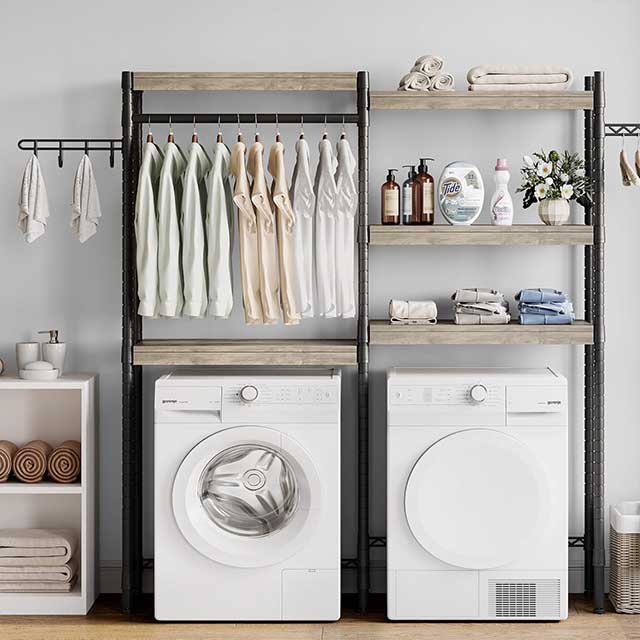 5 Tier Wood Over The Washer and Dryer Storage Shelf with Drying Clothes Racks,Space Saver Heavy Duty Bathroom Laundry Shelf for Home Storage and Decor